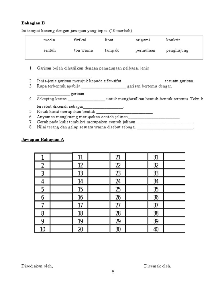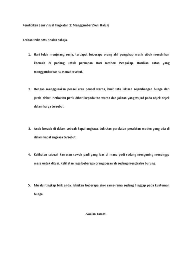 Related Posts To Soalan Dan Jawapan Pendidikan Seni Visual Tingkatan 2 Soalan Dan Jawapan Pendidikan Seni Visual Tingkatan 2 2021-11-12T013400-0800. 1Anda begitu terkejut kerana buah termbikai yang anda beli telah berubah menjadi rumah yang didiami oleh biji-biji tembikai yang mempunyai kaki dan tangan. Bank Soalan Pertengahan Tahun KSSM Tingkatan 2 adalah antara bahan-bahan terbaik yang kami adaBahan yang terdapat di sini memenuhi keperluan Pentaksiran Berasaskan Sekolah yang dilaksanakan secara menyeluruh mengikut prinsip bahawa semua mata pelajaran yang terkandung dalam KSSM memainkan peranan yang penting bagi memenuhi keperluan jasmani.